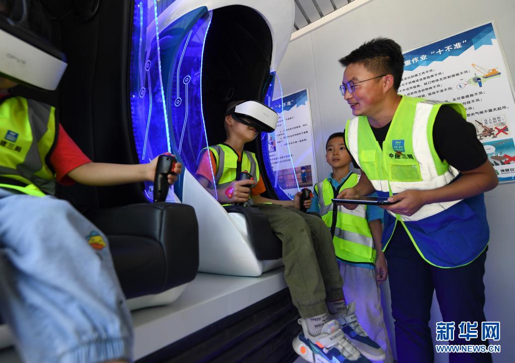 5月29日,在中建三局乌鲁木齐市口腔医院项目工地上,小朋友试用安全VR体验仪器。