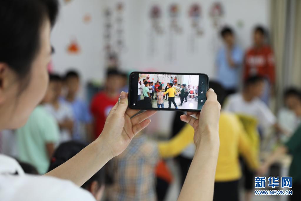 5月29日,在赤水市市中街道滨西社区益童乐园,一名义工用手机拍摄孩子们做游戏的画面。