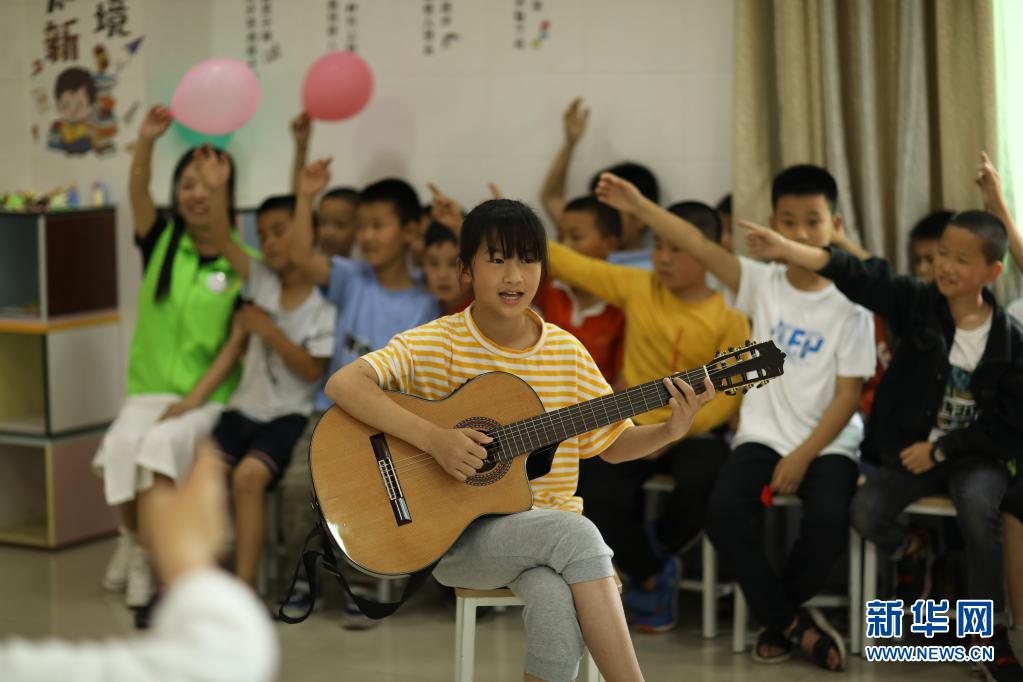 5月29日,在赤水市市中街道滨西社区益童乐园,一名孩子在进行吉他弹唱。