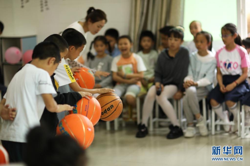 5月29日,在赤水市市中街道滨西社区益童乐园,孩子们在进行拍篮球比赛。