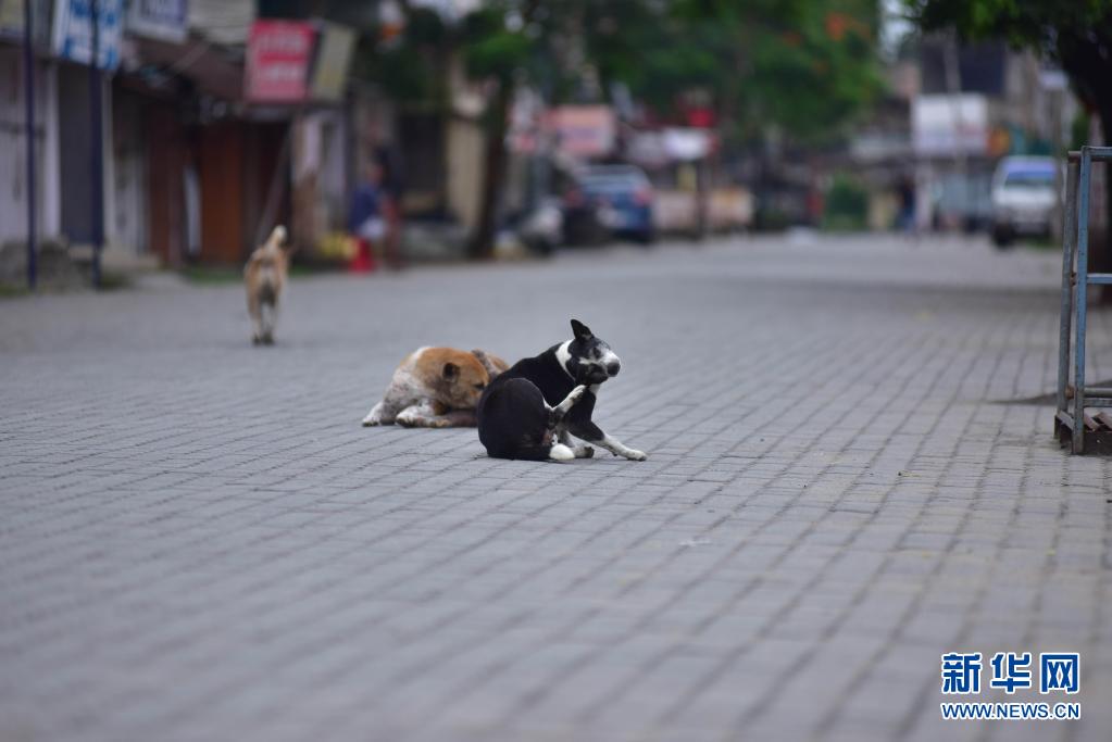 这是5月29日在印度阿萨姆邦瑙贡空旷的街头拍摄的流浪狗。