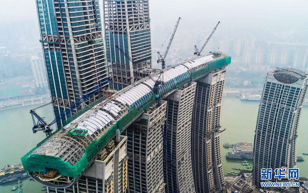 曹亚军领衔的重庆来福士项目幕墙超大装饰单元体水晶连廊超高空液压整体提升工程,实现了当时国内该领域技术突破(2019年1月14日摄,无人机照片)。