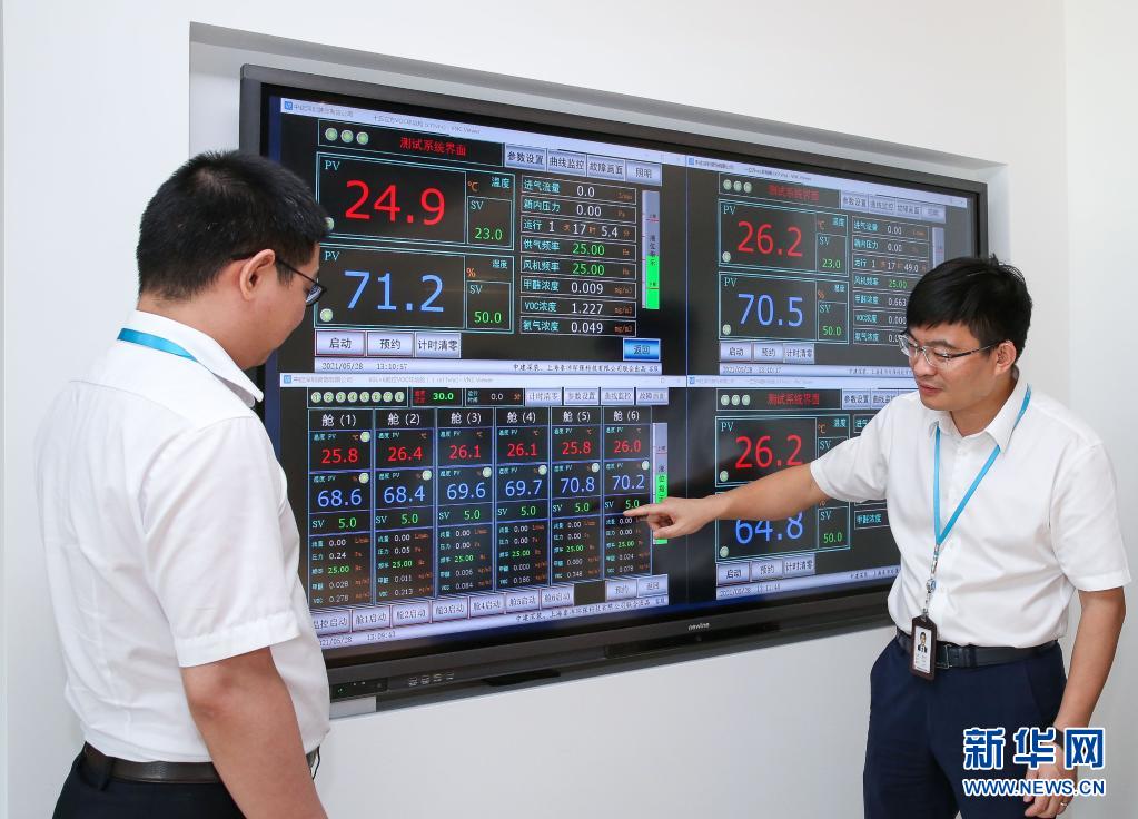 曹亚军(右)在科技创新工作室和团队成员研究绿色健康装修有害气体监测问题(2021年5月28日摄)。