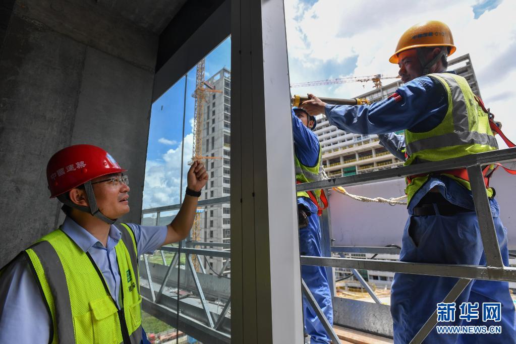 曹亚军(左)在深圳光明科学城启动区工地向幕墙施工人员强调施工技术要领(2021年5月26日摄)。