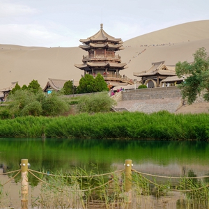 时下,位于甘肃省敦煌市的月牙泉碧波荡漾,吸引不少游客前来观光。