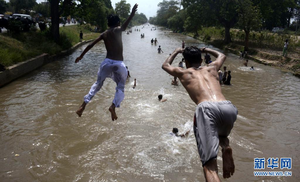 5月30日,年轻人跳入巴基斯坦城市拉合尔的沟渠中享受清凉。