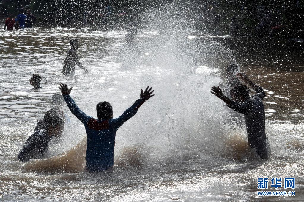 5月30日,人们在巴基斯坦城市拉合尔的沟渠中戏水享受清凉。