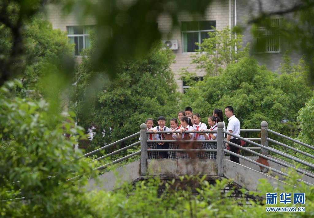 在江西井冈山市井冈山小学,老师熊健带着“小红军宣讲团”的成员在校园里进行义务讲解训练(5月12日摄)。