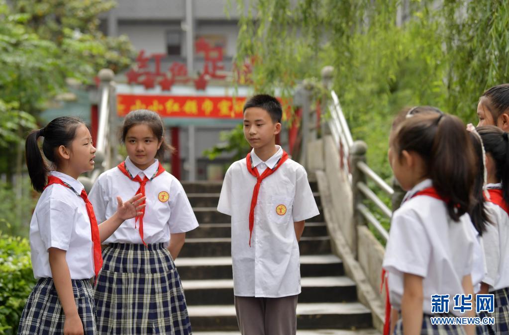 在江西井冈山市井冈山小学,“小红军宣讲团”的成员黄缨婷(左一)在模拟现场讲解(5月12日摄)。