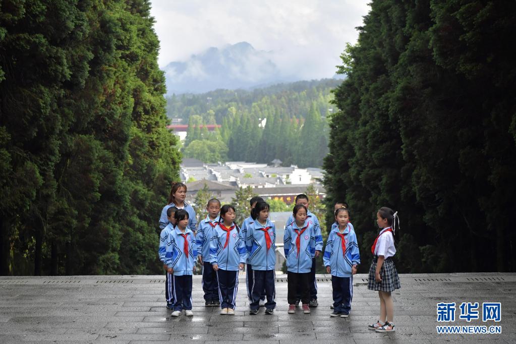 在井冈山革命烈士陵园,“小红军宣讲团”的成员石夏嘉(右一)给前来参观研学的学生们进行义务讲解(5月12日摄)。