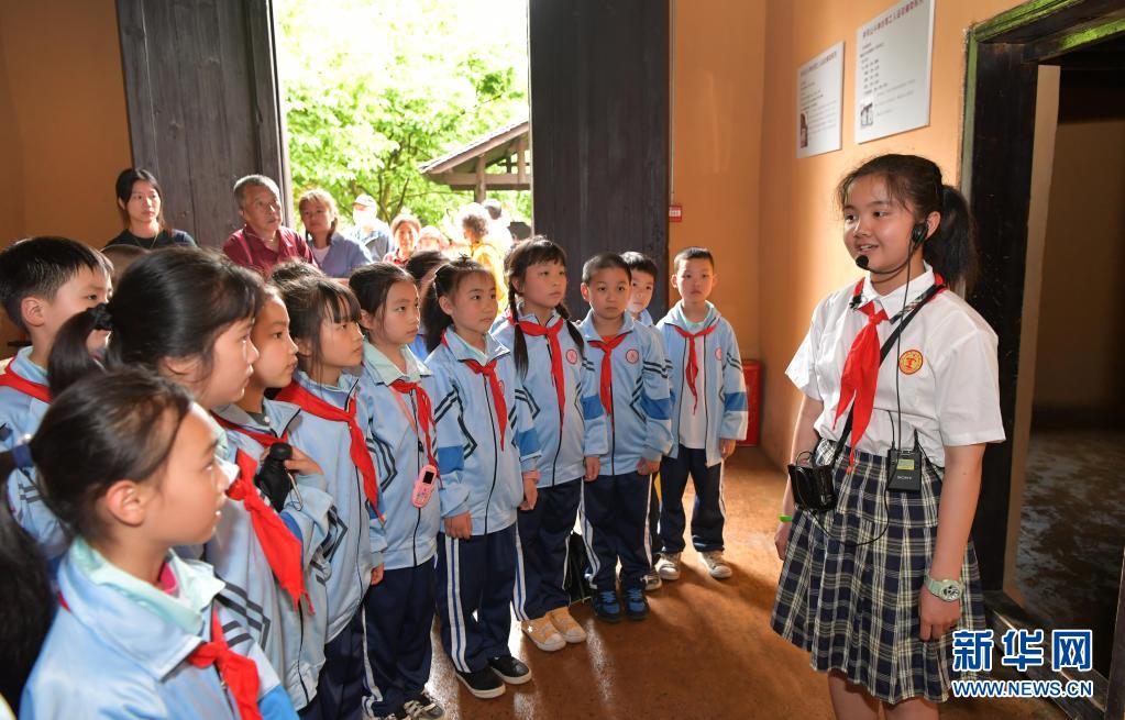 在井冈山茨坪毛泽东同志旧居,“小红军宣讲团”的成员李楚妍(右一)给前来参观研学的学生们进行义务讲解(5月12日摄)。