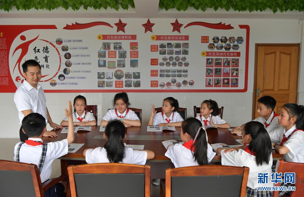 在江西井冈山市井冈山小学,老师熊健带着“小红军宣讲团”的成员们学习红色故事(5月12日摄)。