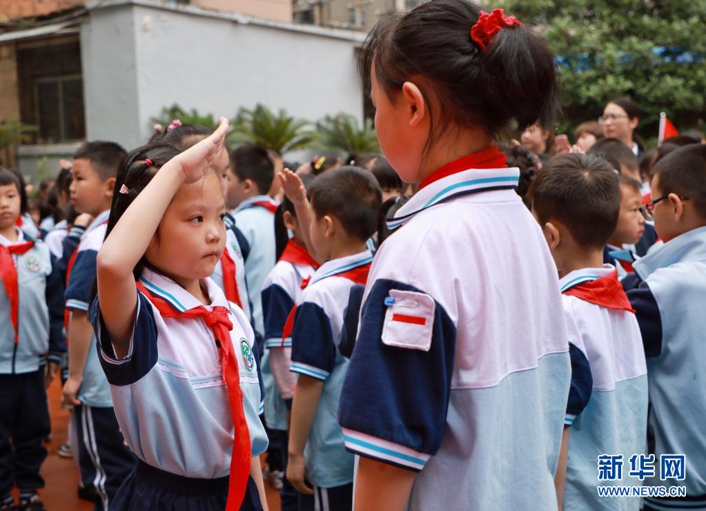 5月31日,新入队的少先队员在入队仪式上向高年级少先队员敬礼。