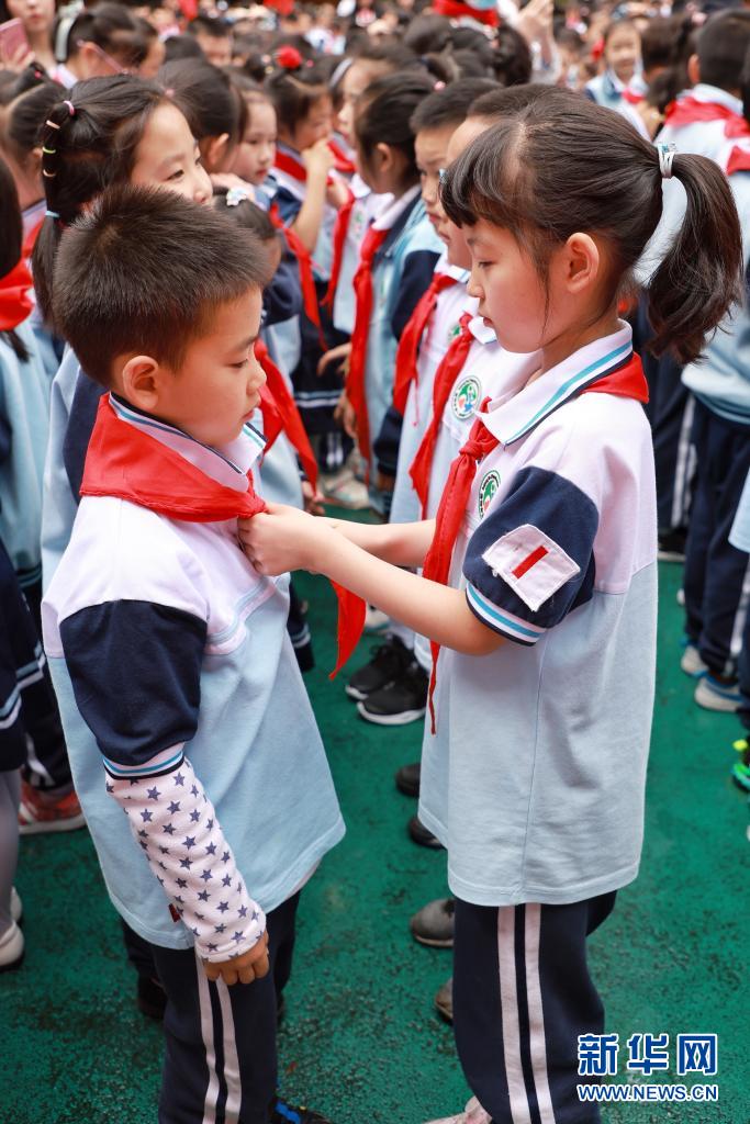 5月31日,高年级的少先队员在入队仪式上为新入队的同学系红领巾。