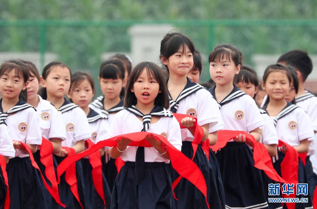 5月31日,四川省华蓥市高兴镇小学学生手捧红领巾参加入队仪式。