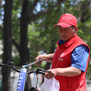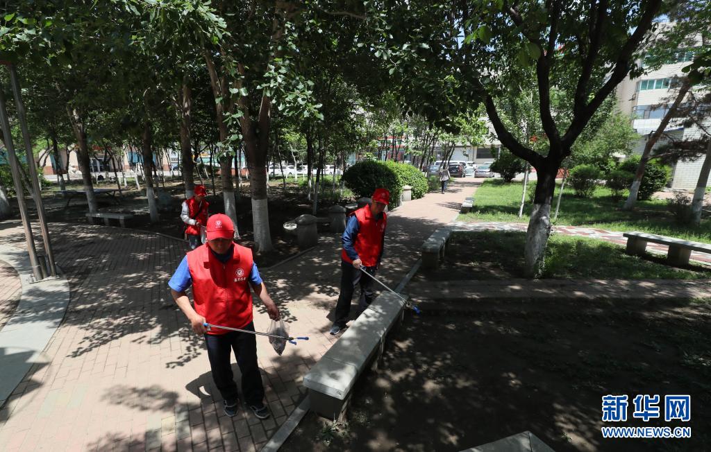 5月24日,在沈阳市苏家屯区火车站站前公园,谷多绵和其他志愿者在捡拾烟蒂和垃圾。新华社记者 杨青 摄