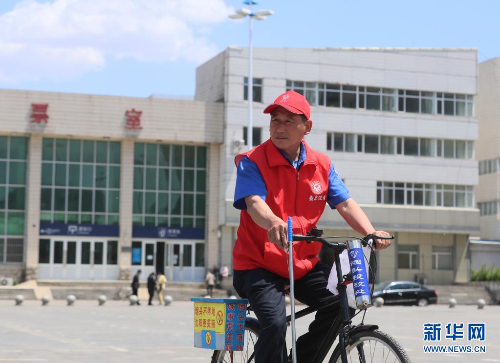 5月24日,在沈阳市苏家屯区火车站站前广场,谷多绵骑自行车准备开始捡拾烟蒂和垃圾的工作。新华社记者 杨青 摄