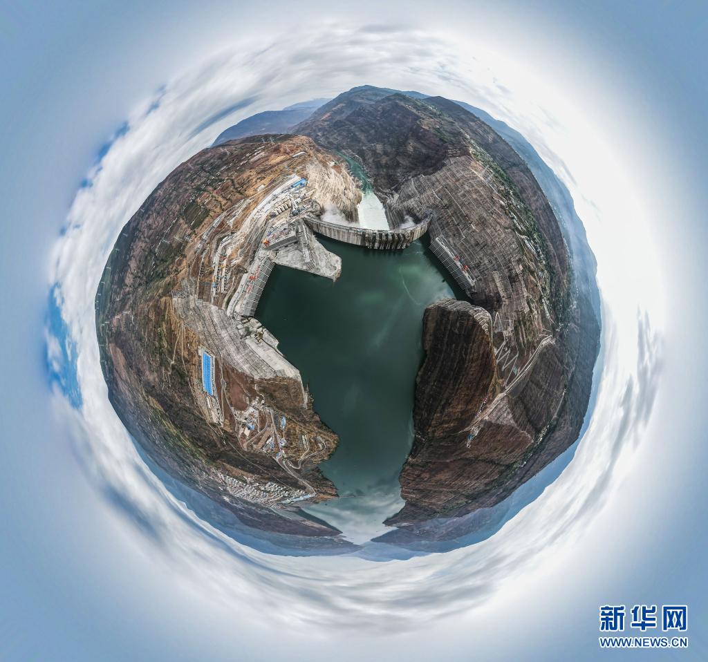 5月31日拍摄的建设中的白鹤滩水电站(无人机全景照片)。