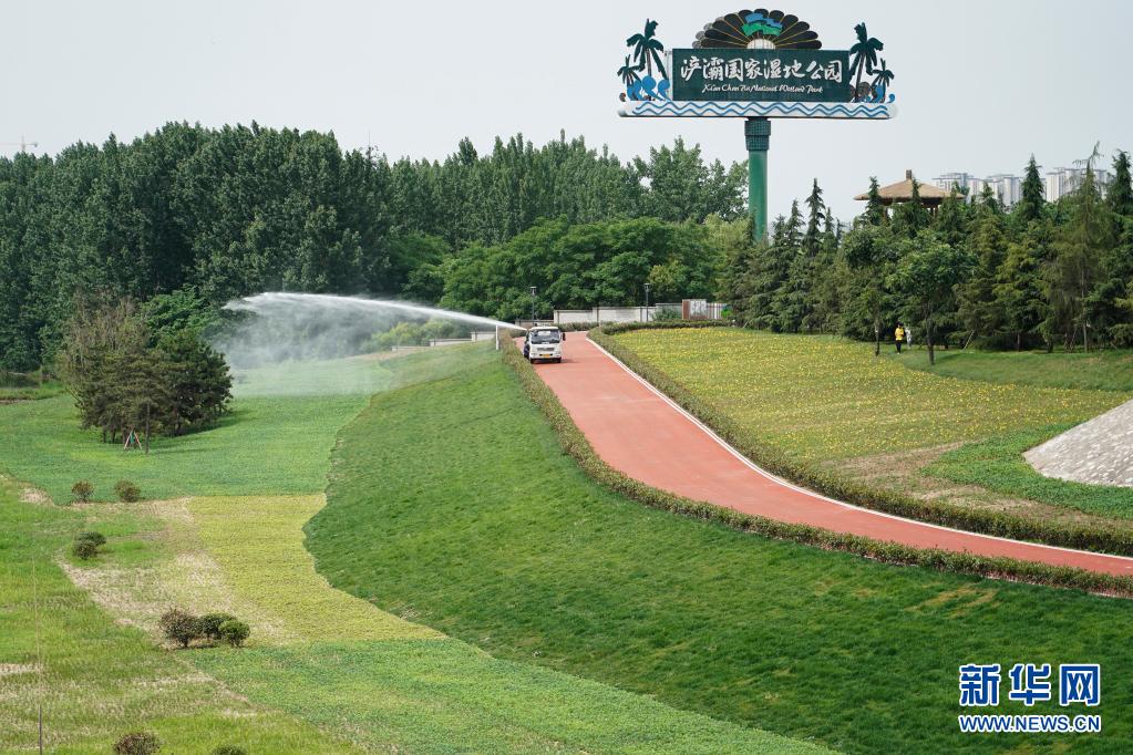 5月26日,在西安浐灞国家湿地公园内,工程车辆在为绿化景观浇水。新华社记者 邵瑞 摄