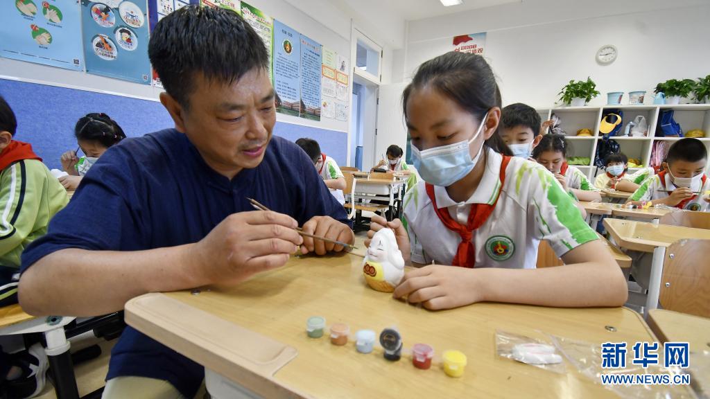 5月31日,北京泥彩塑代表性传承人张忠强(左)为学生讲解兔儿爷的制作和着色技艺。