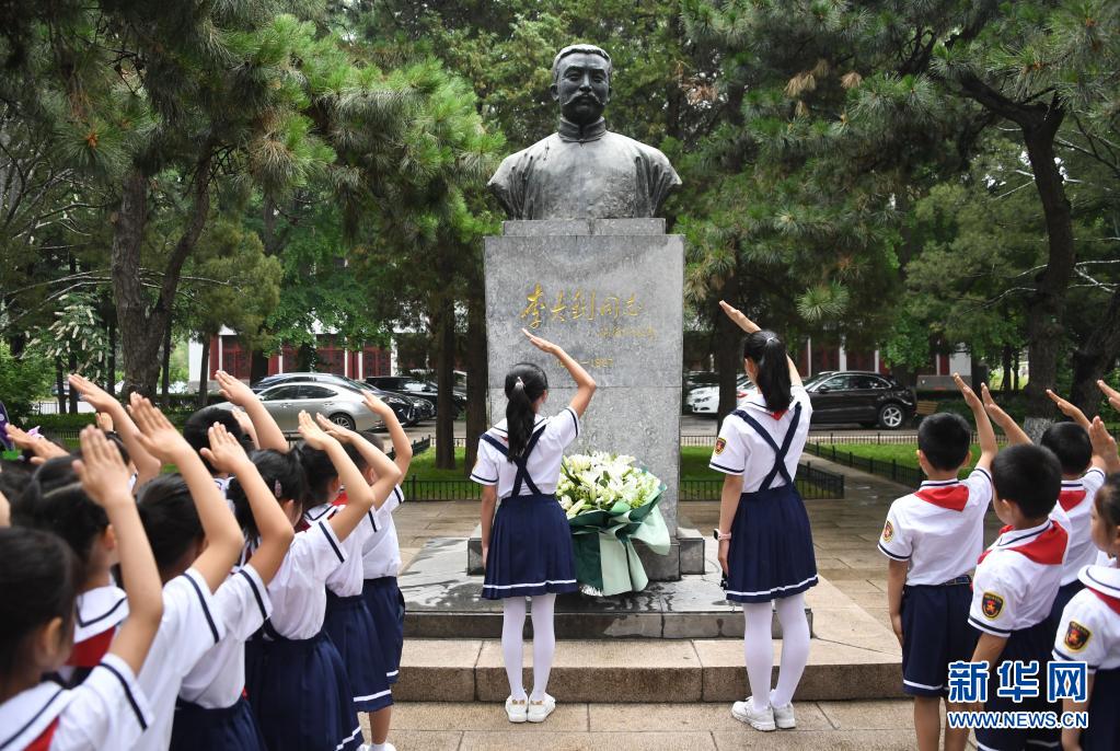 5月31日,参加“红领巾心向党 争做新时代好队员”活动的少先队员们向李大钊塑像敬队礼。