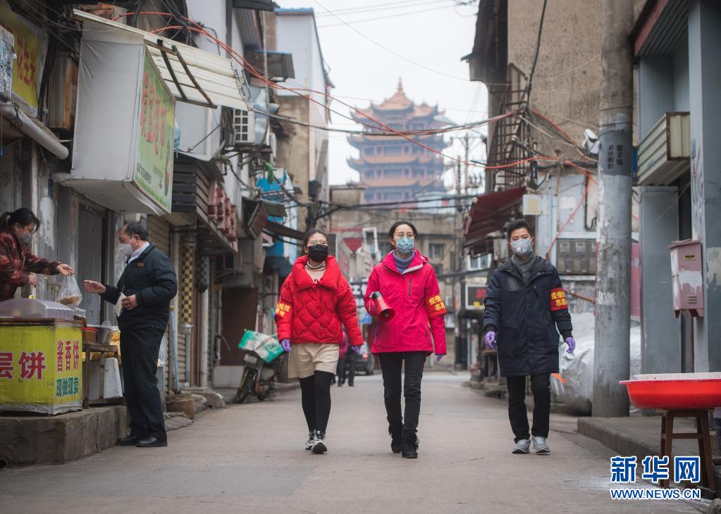 湖北省武汉市中华路街道西城壕社区党委书记翁文静(右二)与志愿者柳莹(右三)、张琦(右一)上街进行防疫宣讲(2020年2月7日摄)。