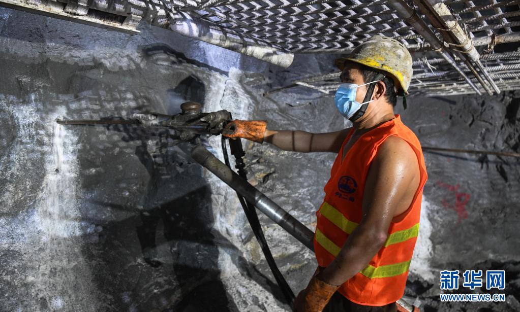 施工人员在进行钻孔作业,为隧道爆破贯通做准备(5月30日摄)。