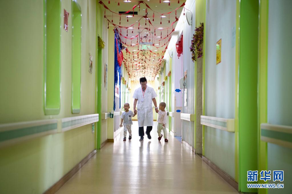 在太原市社会(儿童)福利院,党龙祥带孩子们在楼道散步(5月26日摄)。新华社记者 杨晨光 摄