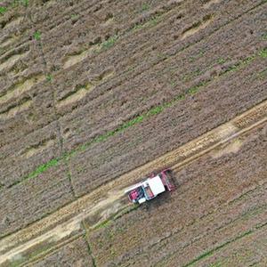 6月1日,在合肥市蜀山区小庙镇段冲村,农机手操作机械设备收割小麦(无人机照片)。