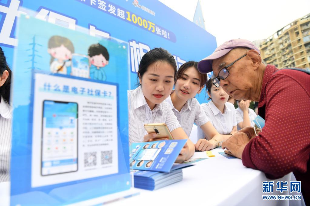 6月1日,在启动仪式现场一位读者在工作人员在指导下开通电子社保卡。