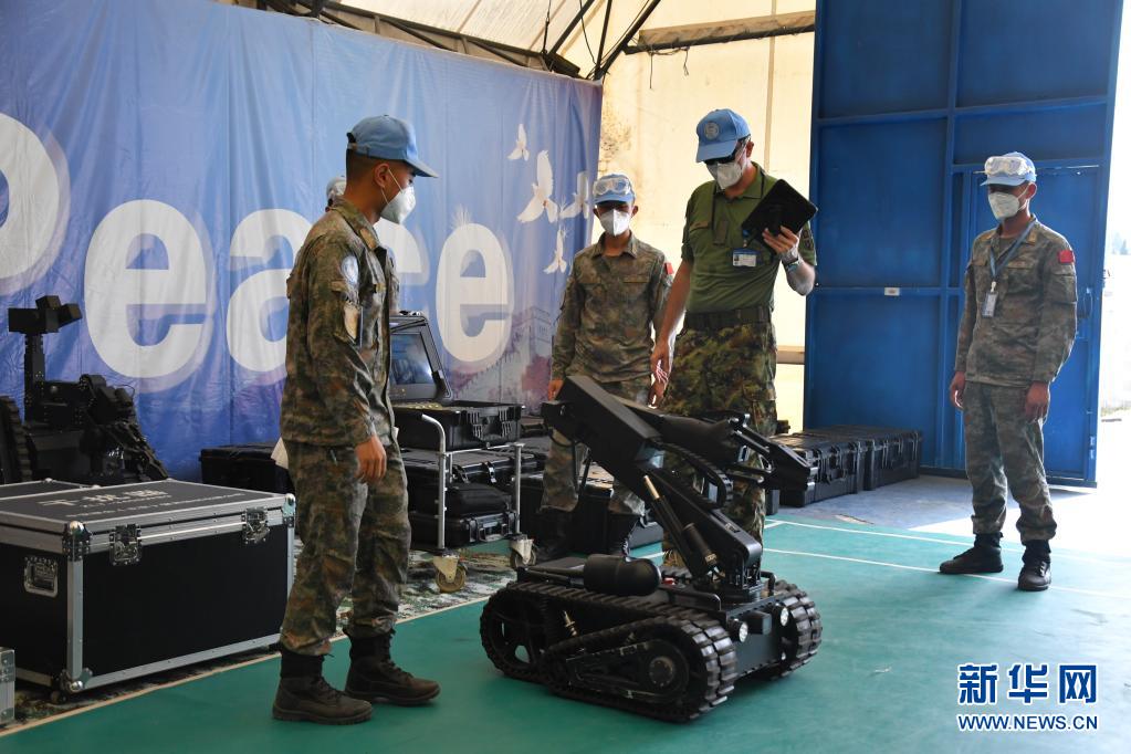 5月31日,在黎巴嫩南部辛尼亚村中国营,中国排爆组官兵向联黎部队司令部装备核查组演示排爆机器人的操作。