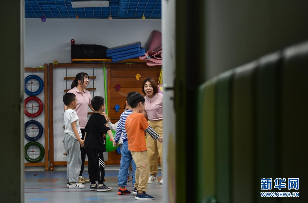 5月25日,周敏(右)和同事在芜湖市翰宁教育尊纳儿童发展中心陪孩子们玩耍。
