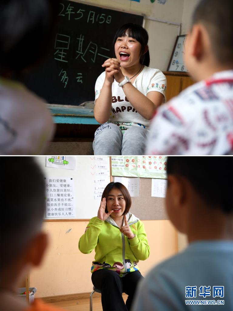这是一张拼版照片,上图为:在合肥市春芽残疾人互助协会,周敏靠大声讲话来吸引孩子们的注意力(2012年5月15日摄);下图为:2021年5月31日,周敏在合肥的康复机构给孩子们上课。新华社记者刘军喜摄
