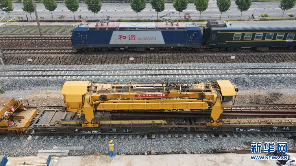 6月1日,中铁六局的建设者在和邢铁路铺轨施工现场作业(无人机照片)。
