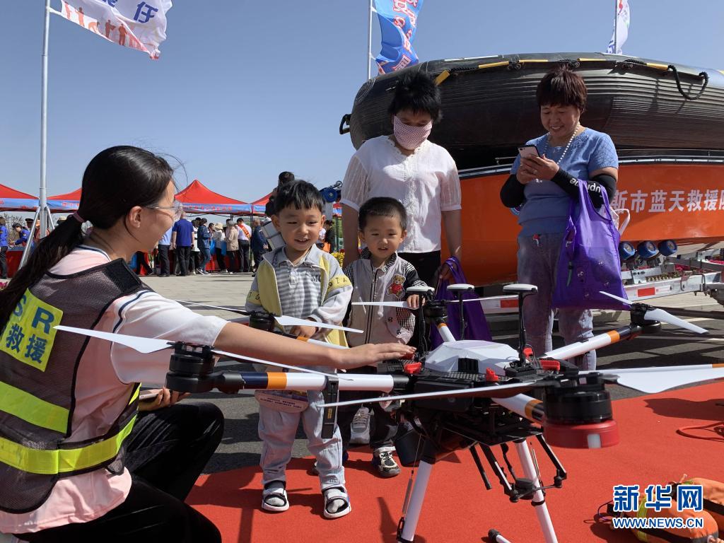 6月1日,在“安全生产月”启动仪式现场,鄂尔多斯市蓝天救援队的志愿者向市民讲解无人机在救援中的应用。