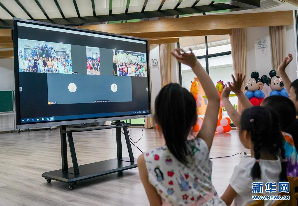 6月1日,上海市徐汇区科技幼儿园与云南某幼儿园的小朋友们进行视频连线,互致问候。