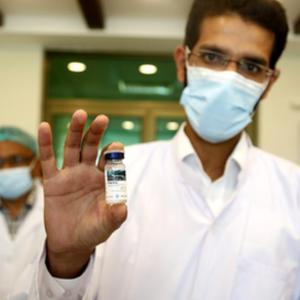 6月1日,在巴基斯坦伊斯兰堡,工作人员展示本地灌装生产的中国康希诺新冠疫苗。