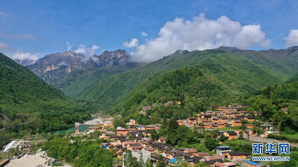 这是5月18日拍摄的陇南市宕昌县官鹅沟景区内的鹿仁村村貌(无人机照片)。