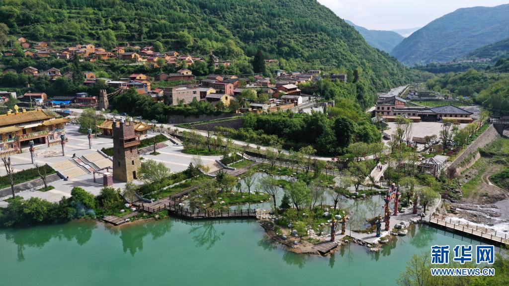 这是5月18日拍摄的陇南市宕昌县官鹅沟景区内的鹿仁村藏羌风情园(无人机照片)。