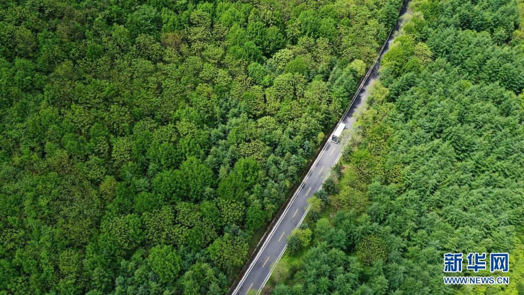 一辆旅游大巴行驶在陇南市宕昌县官鹅沟景区内的公路上(无人机照片,5月18日摄)。