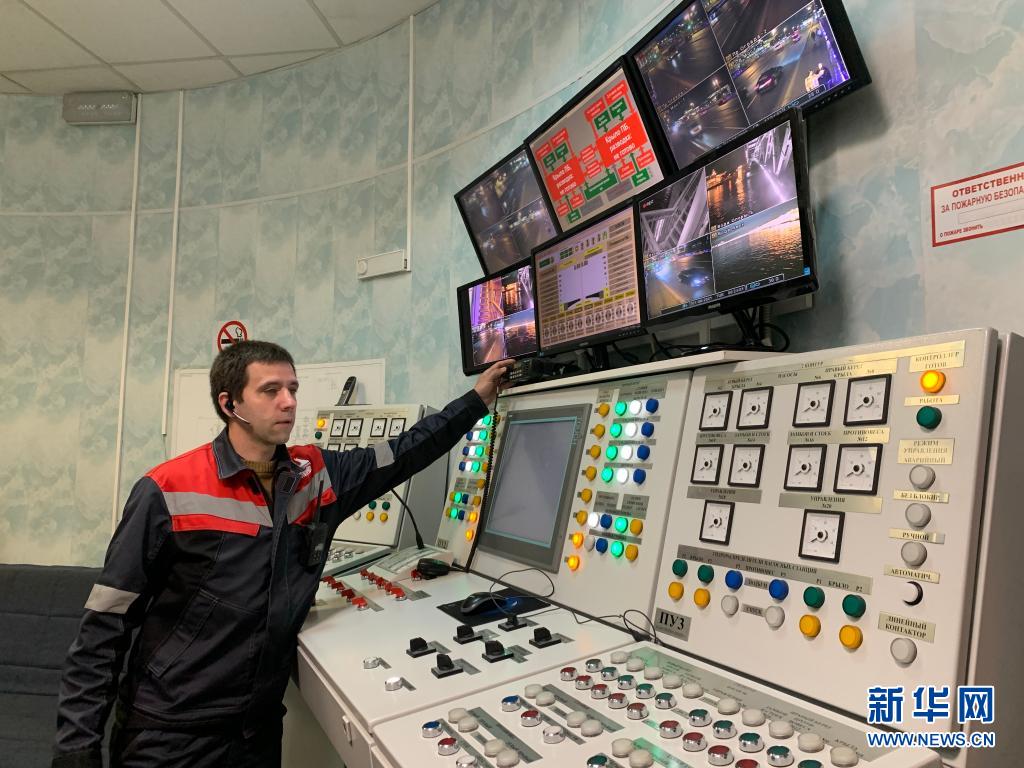 6月1日凌晨,工作人员在俄罗斯圣彼得堡冬宫桥的控制室内介绍开桥操控程序。
