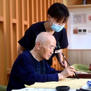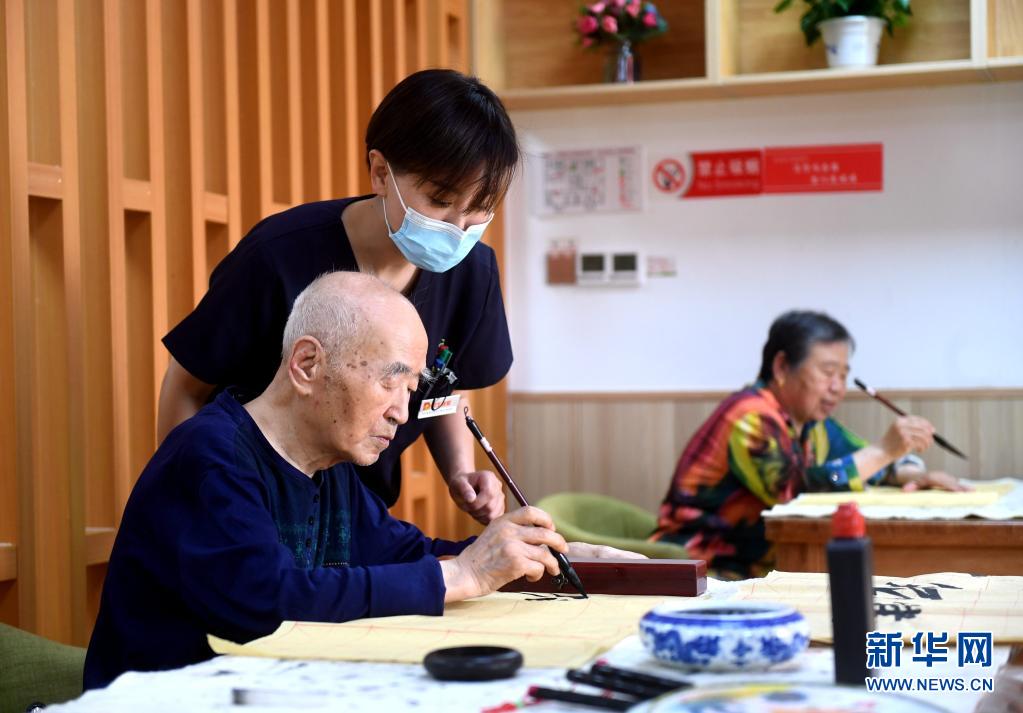 6月2日,在石家庄桥西区振头街道普爱养老照护中心,老人在写毛笔字。