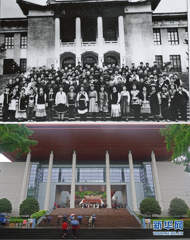 拼版照片:上图为1978年少数民族参观团在井冈山革命博物馆前合影(资料照片);下图为2021年4月27日,游客在井冈山革命博物馆参观(新华社记者 万象 摄)。新华社发