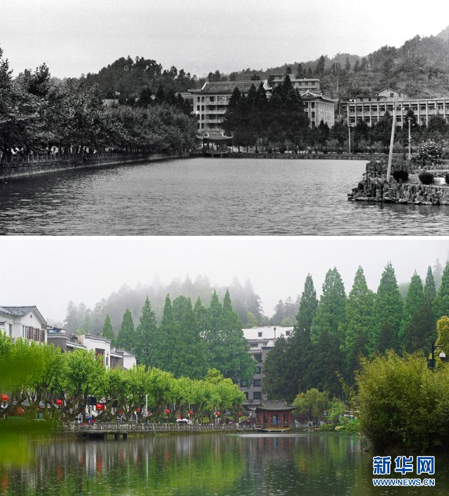 拼版照片:上图为上世纪70年代拍摄的井冈山挹翠湖公园一景(资料照片);下图为2021年4月27日拍摄的井冈山挹翠湖公园一景(新华社记者 万象 摄)。新华社发