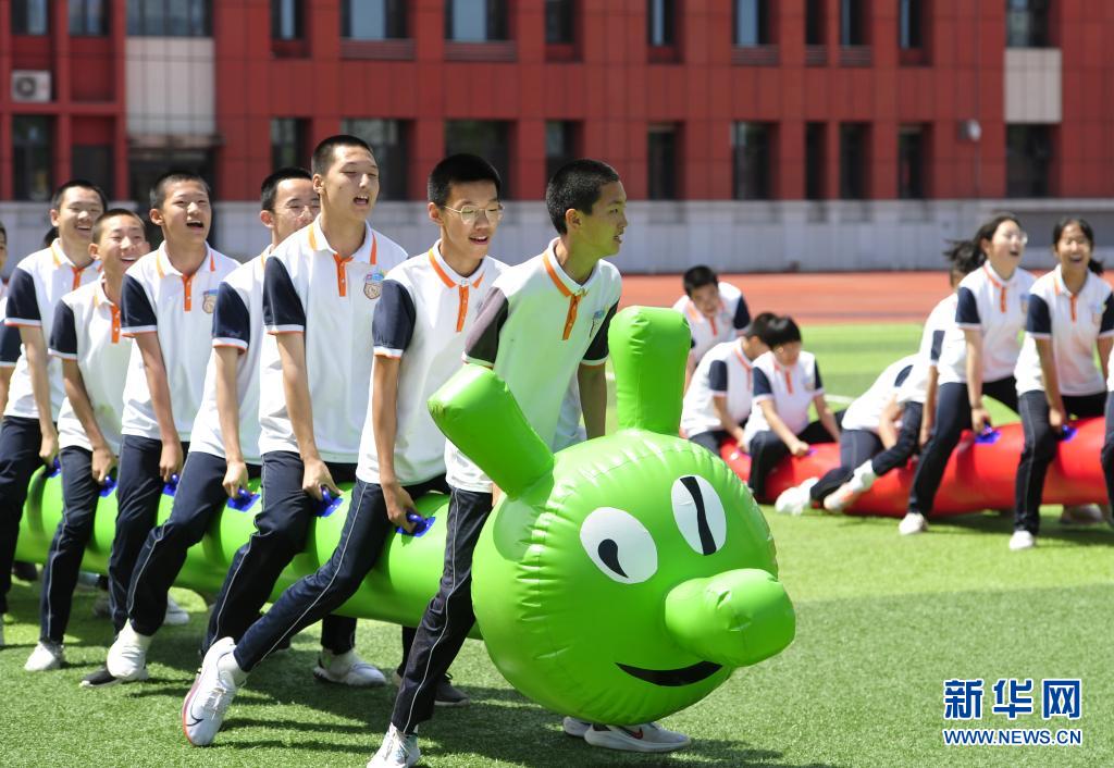 6月3日,沧州市第十七中学的学生在体育课上进行“奋勇前进”运动项目比赛。