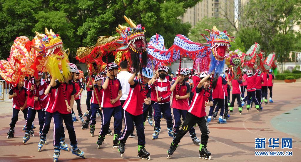 6月3日,沧州市育红小学的学生在体育课上练习轮滑舞龙。