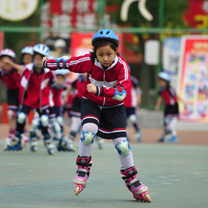 6月3日,沧州市育红小学的学生在体育课上练习轮滑。