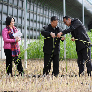 在宁夏银川市永宁县闽宁镇,福建农林大学教授林占熺(右二)与农户交流菌草种植技术(3月29日摄)。新华社记者 王鹏 摄