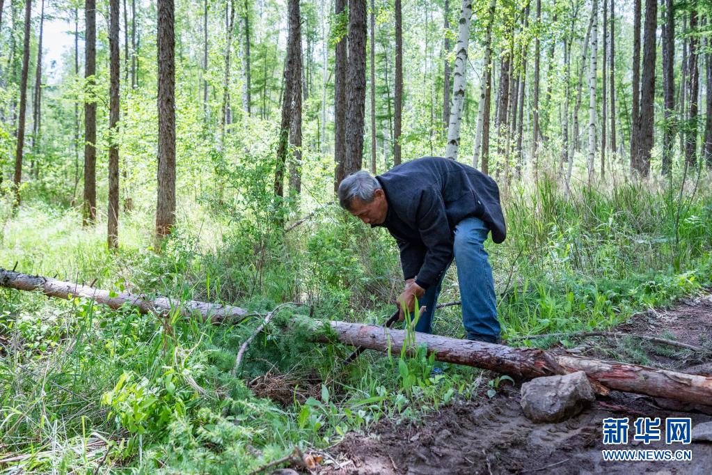 6月3日,在黑龙江省伊春市乌马河林业局有限公司乌马河林场分公司施业区,张英善用锯切割风倒木,疏通道路。新华社记者 谢剑飞 摄