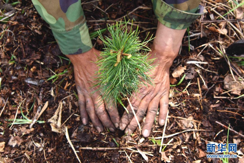 在黑龙江省伊春市乌马河林业局乌马河林场分公司施业区,张英善在种树(2018年5月17日摄)。新华社记者 杨思琪 摄